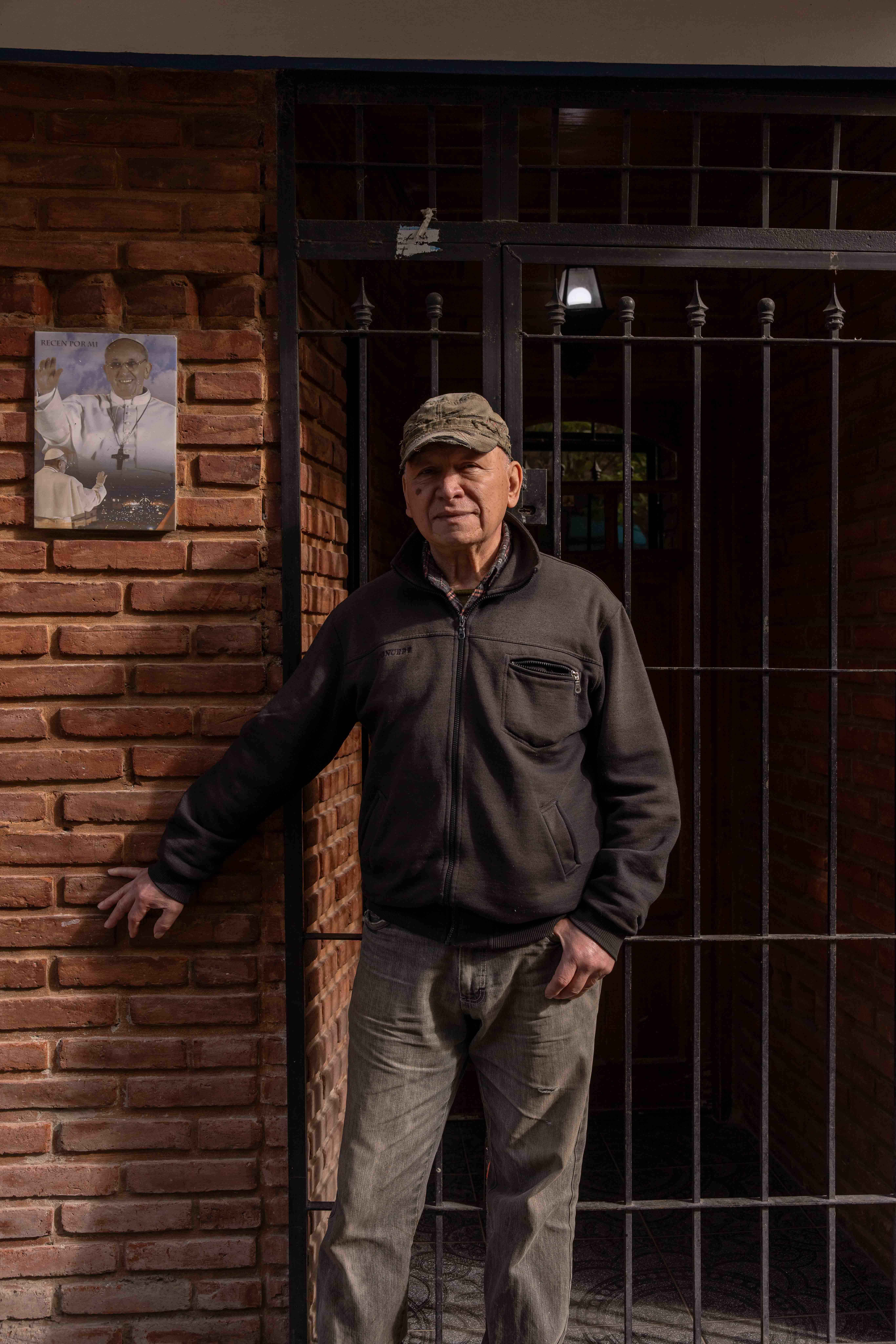 En otra foto, Nicolás se apoya contra la reja de un comedor al que asiste todos los días para retirar su comida, junto a un póster del papa Francisco. Su mirada fija, entre firmeza y cansancio, parece interpelar a quien lo observa: ¿Cuánto vale una vida de trabajo cuando el sistema responde con exclusión? Lo sabe en carne propia: “Me dicen que no tengo aportes suficientes, como si nunca hubiera trabajado. Como si mi vida no contara”.
